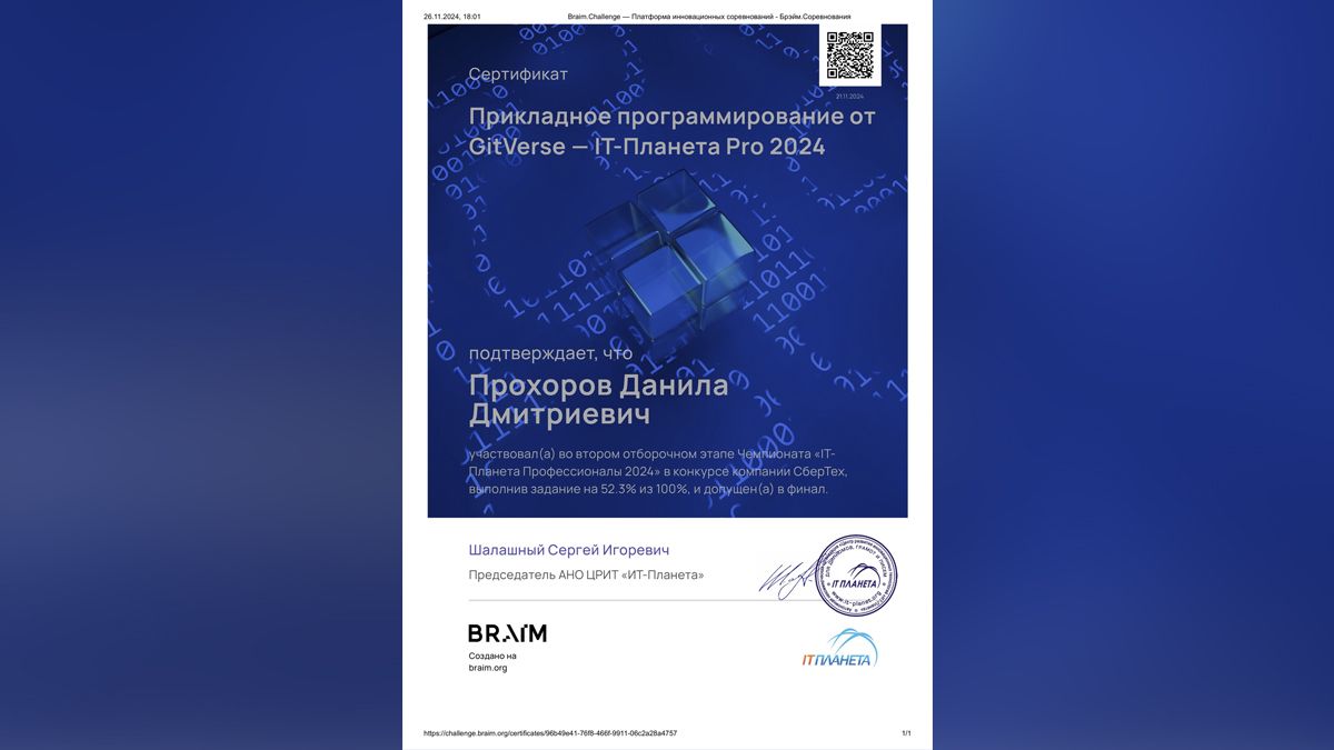 Прохоров Данила, студент факультета Металлургические технологии Новотроицкого филиала Университета "МИСИС" успешно прошёл отборочные этапы конкурсов Чемпионата «IT-Планета Профессионалы 2024» и приглашён к участию в финале Чемпионата.